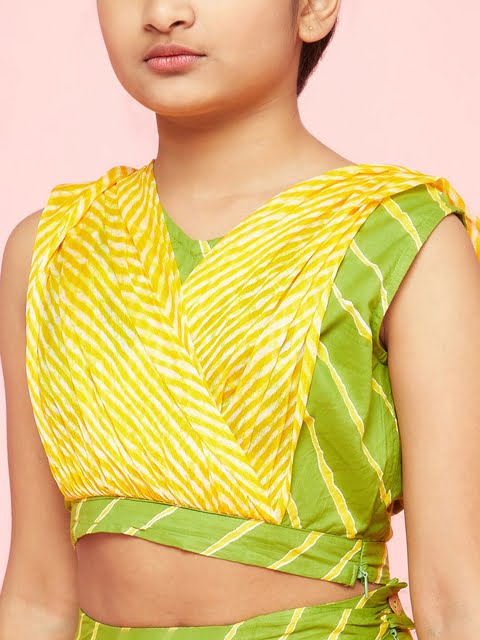 Green and yellow leheriya printed ready to wear blouse, has a v-neck, sleeveless, zip closure