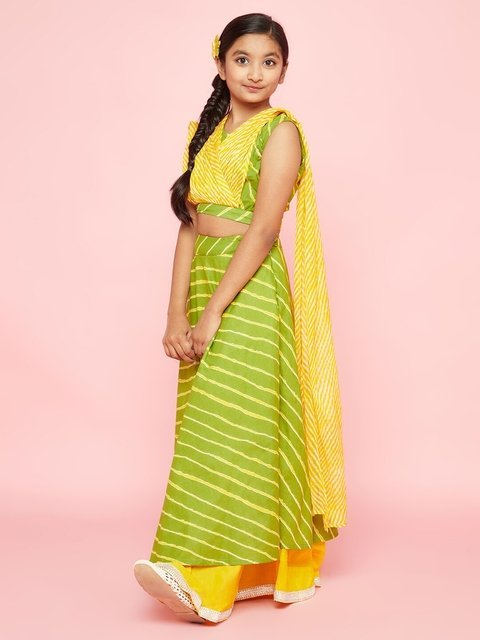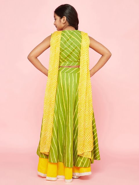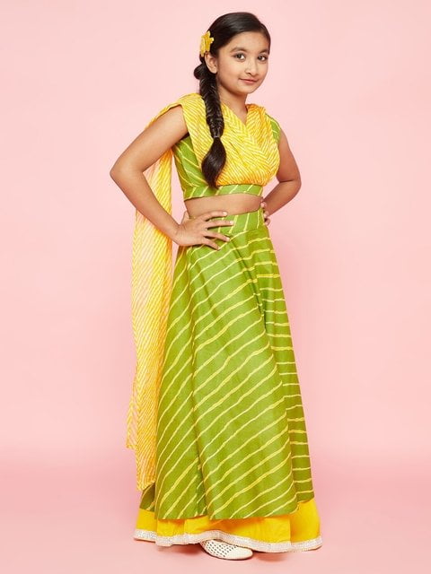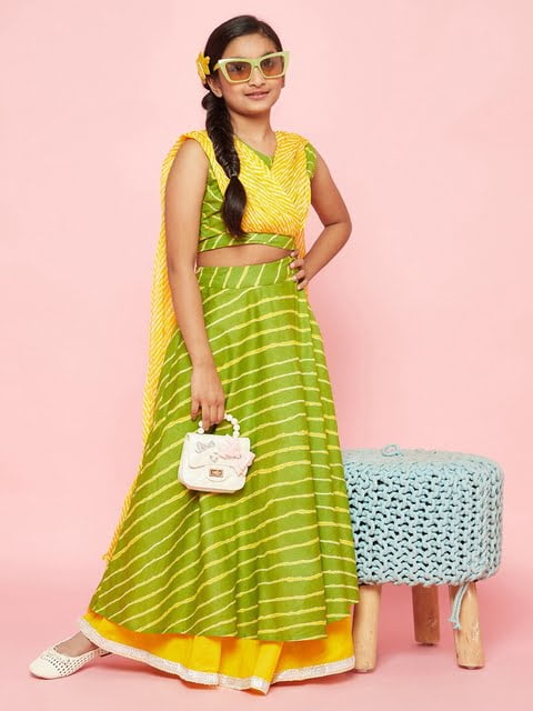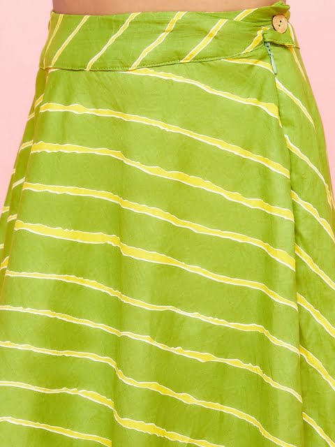 Green and yellow leheriya printed ready to wear lehenga, has zip closure, flared hem