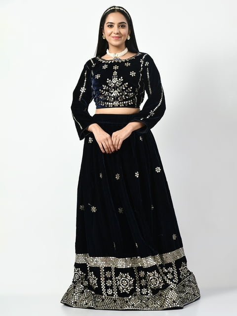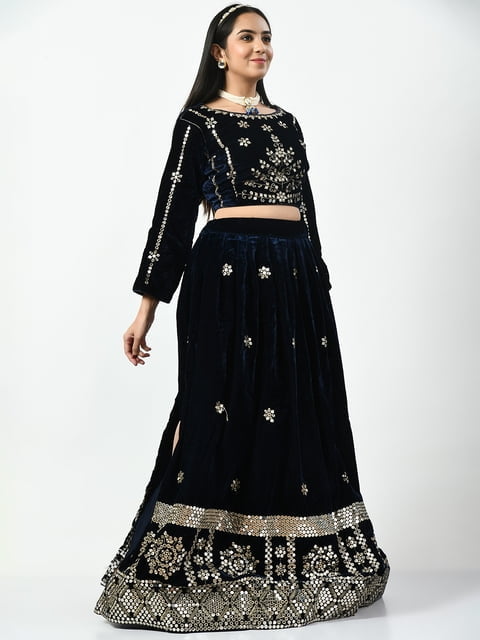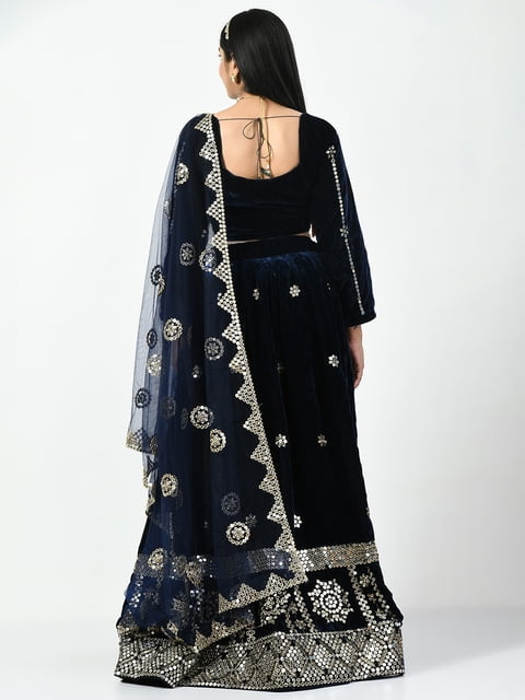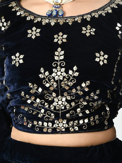 Navy blue and gold-toned embellished unstitched blouse, has a round neck, three-quarter sleeves, navy blue and gold-toned embellished semi-stitched lehenga, flared hem