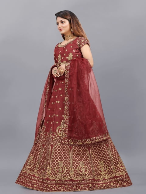 Maroon and gold-toned embroidered lehenga choli with dupatta, thread work