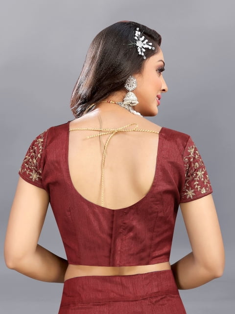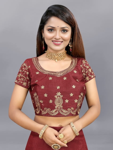 Maroon and gold-toned embroidered unstitched blouse, has a round neck, short sleeves, maroon and gold-toned embroidered semi-stitched lehenga, flared hem