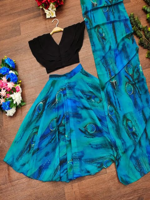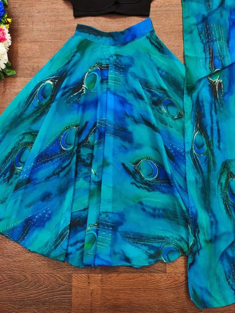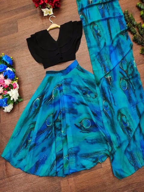 Blue embellished ready to wear blouse, has a v-neck, sleeveless, blue printed ready to wear lehenga, flared hem