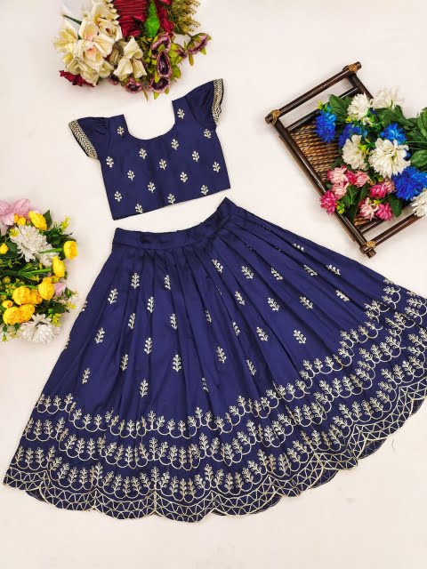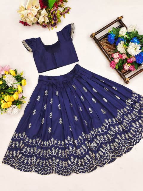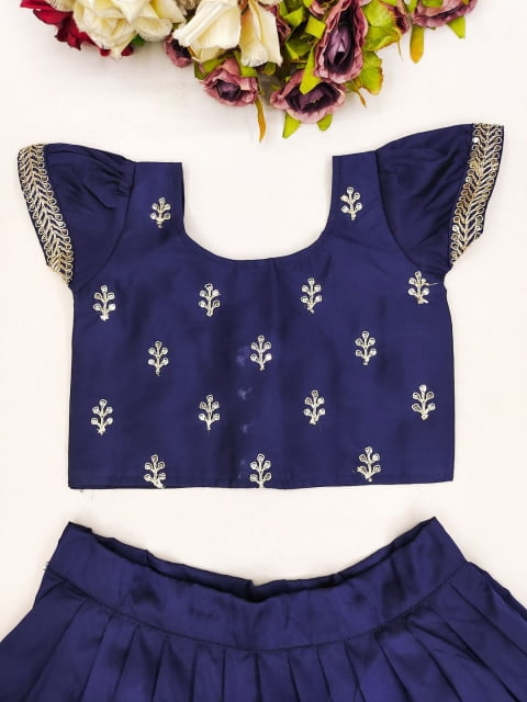 Blue and gold-toned embroidered ready to wear blouse, has a round neck, short sleeves, blue and gold-toned embroidered ready to wear lehenga, flared hem