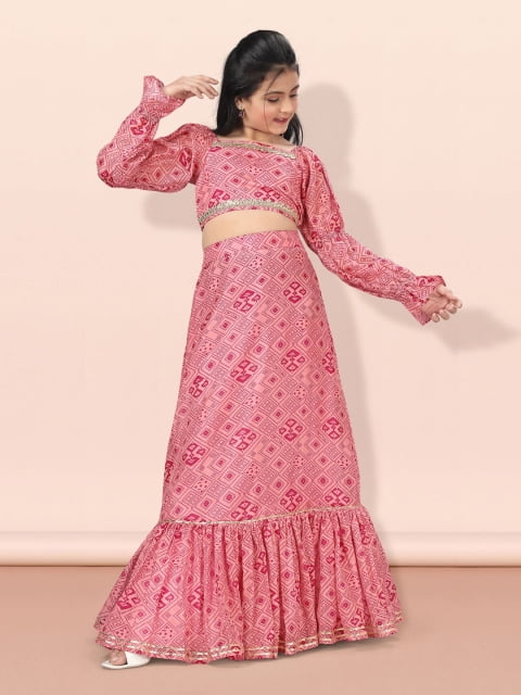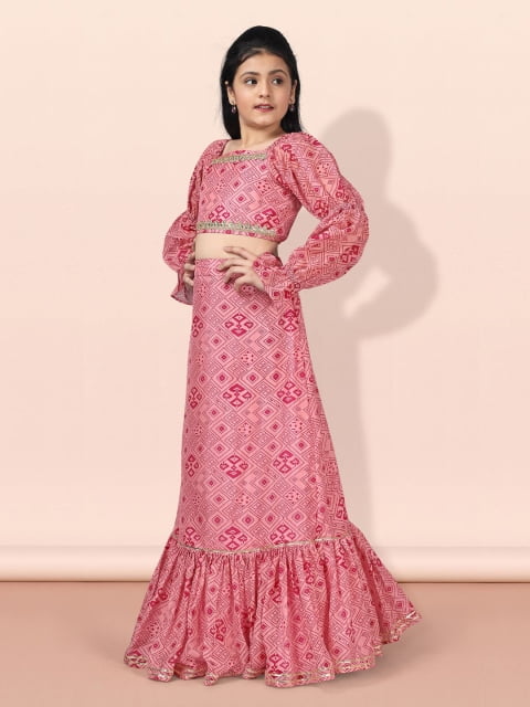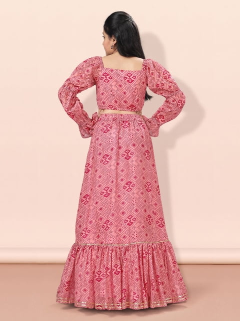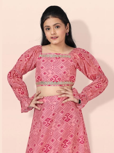 Peach-coloured and red printed ready to wear blouse, has a square neck, long sleeves, peach-coloured and red printed ready to wear lehenga, has slip-on closure, flared hem
