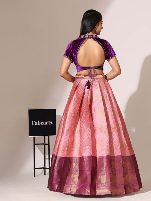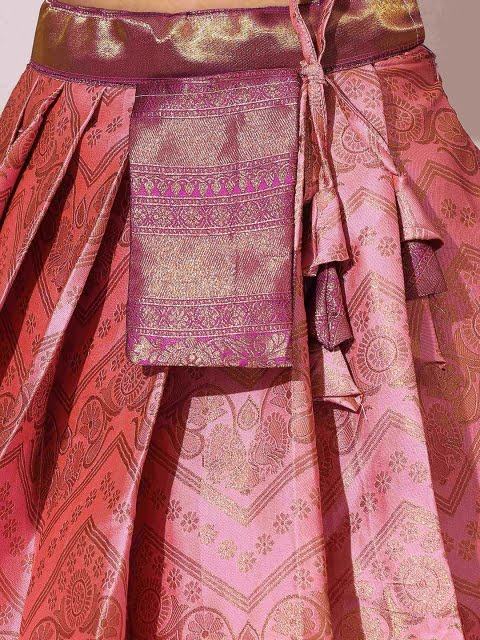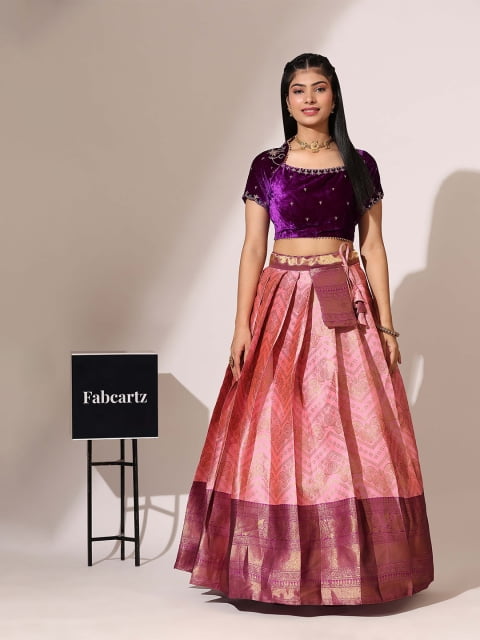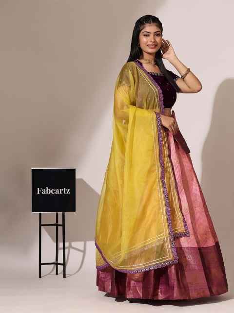 Pink and yellow embroidered unstitched blouse, has a square neck, short sleeves, pink and yellow woven design semi-stitched lehenga, flared hem