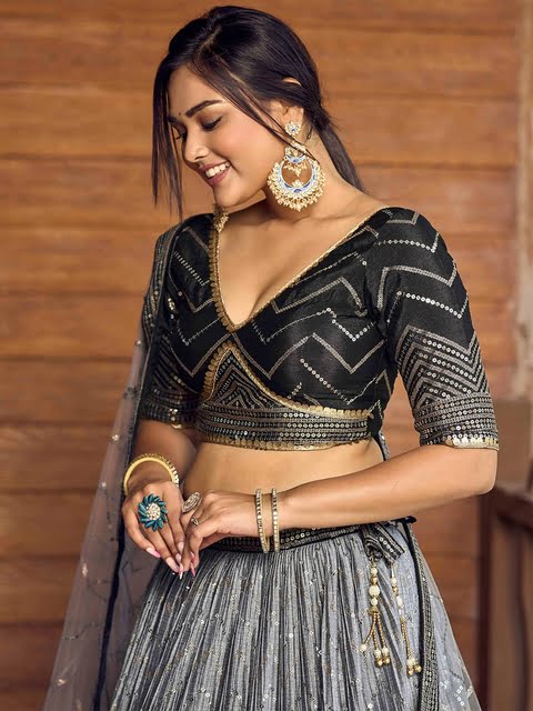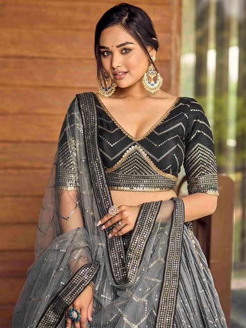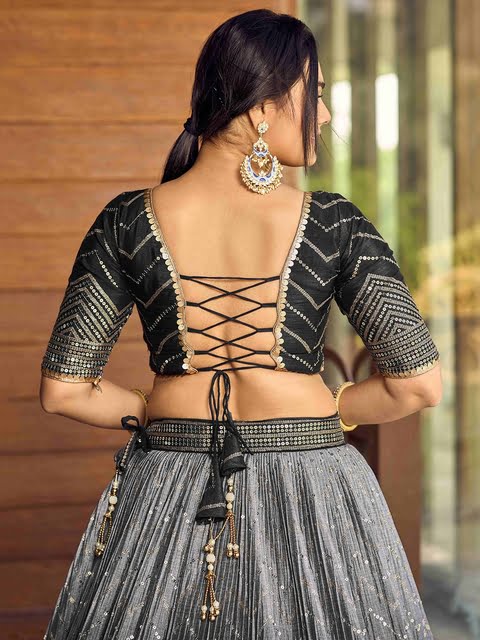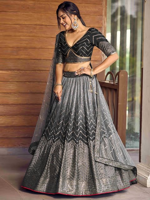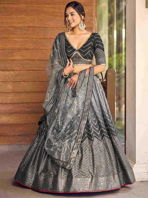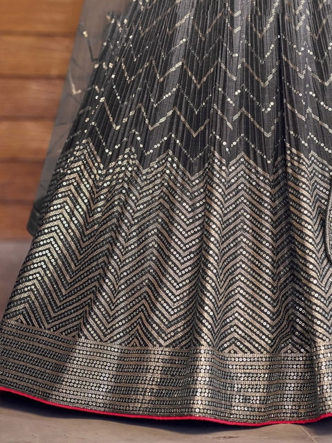 Black and silver-toned embroidered lehenga choli with dupatta, sequinned