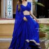 blue and gold-toned printed semi-stitched lehenga, flared hem