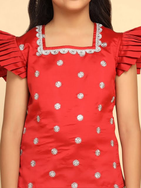 Red and green embroidered ready to wear blouse, has a square neck, short sleeves