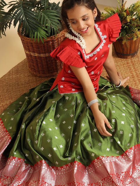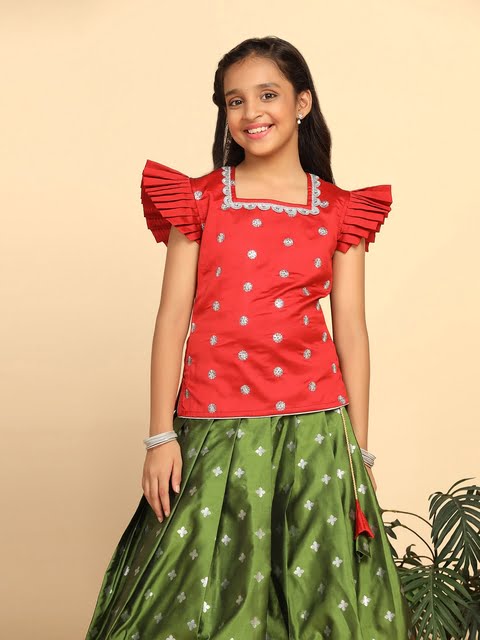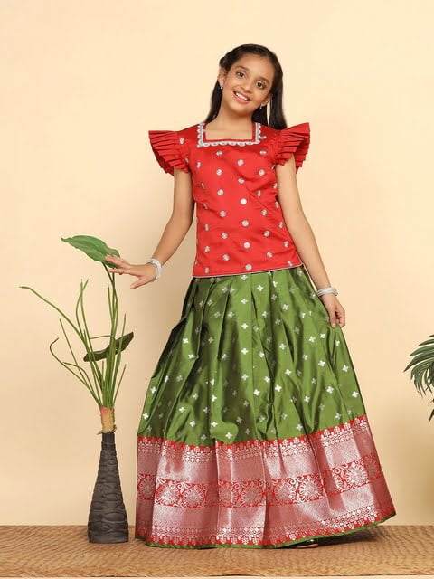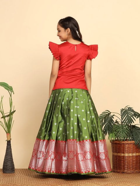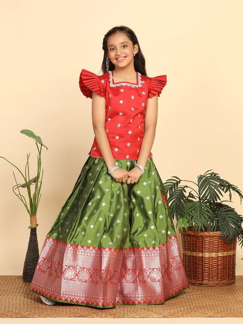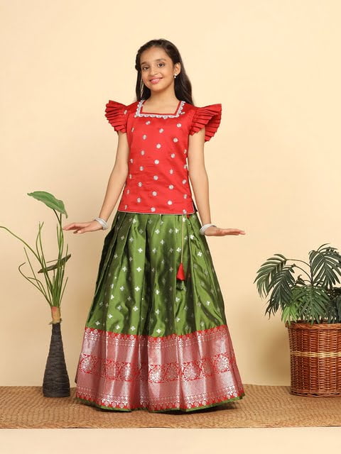 Red and green woven design ready to wear lehenga, flared hem