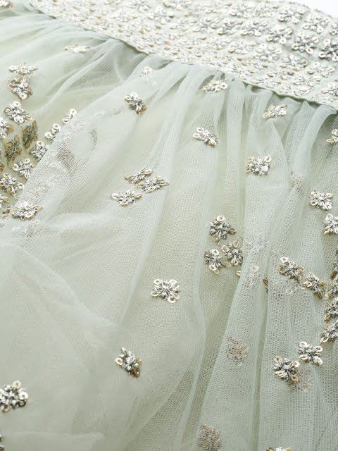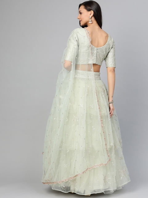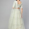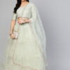 Green and gold-toned embroidered lehenga choli with dupatta, sequinned