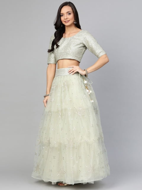 Green and gold-toned embroidered unstitched blouse, has a u-neck, short sleeves, green and gold-toned embroidered semi-stitched lehenga, flared hem