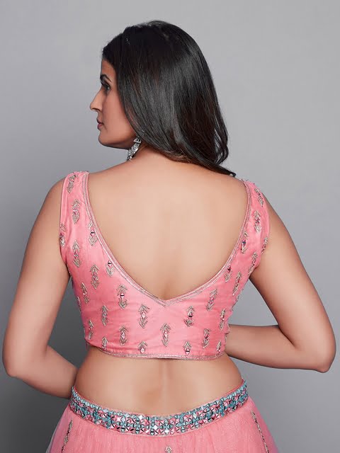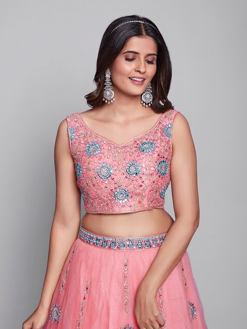 Pink and turquoise blue embroidered ready to wear blouse, has a v-neck, sleeveless, zip closure