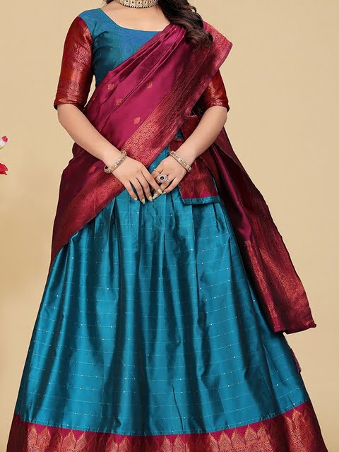 Turquoise blue and purple woven design semi-stitched blouse, has a boat neck, long sleeves, turquoise blue and purple woven design semi-stitched lehenga, flared hem