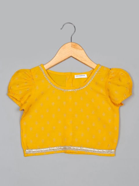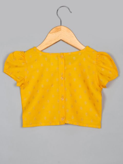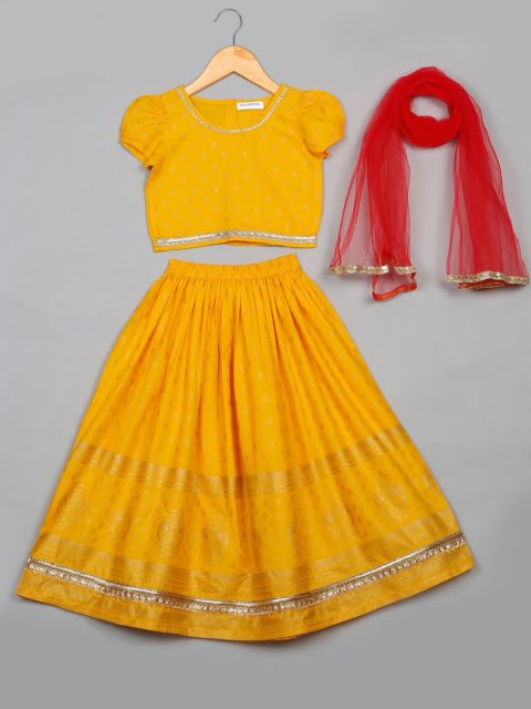 Yellow and red solid ready to wear blouse, has a round neck, short sleeves, yellow and red solid ready to wear lehenga, has slip-on closure, flared hem