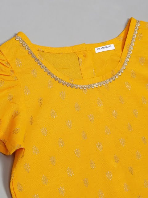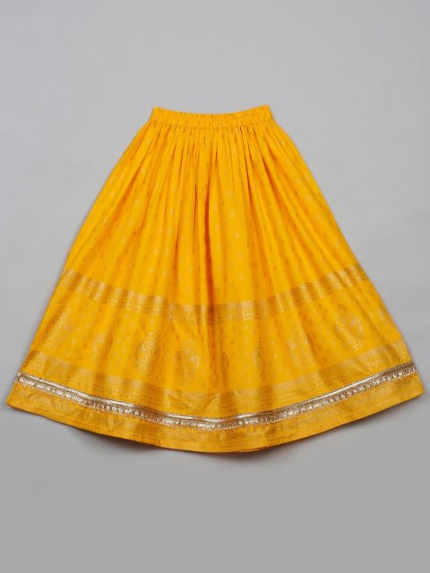 Saka Designs Golden Foil Printed Rayon Yellow Lehenga Choli With Dupatta